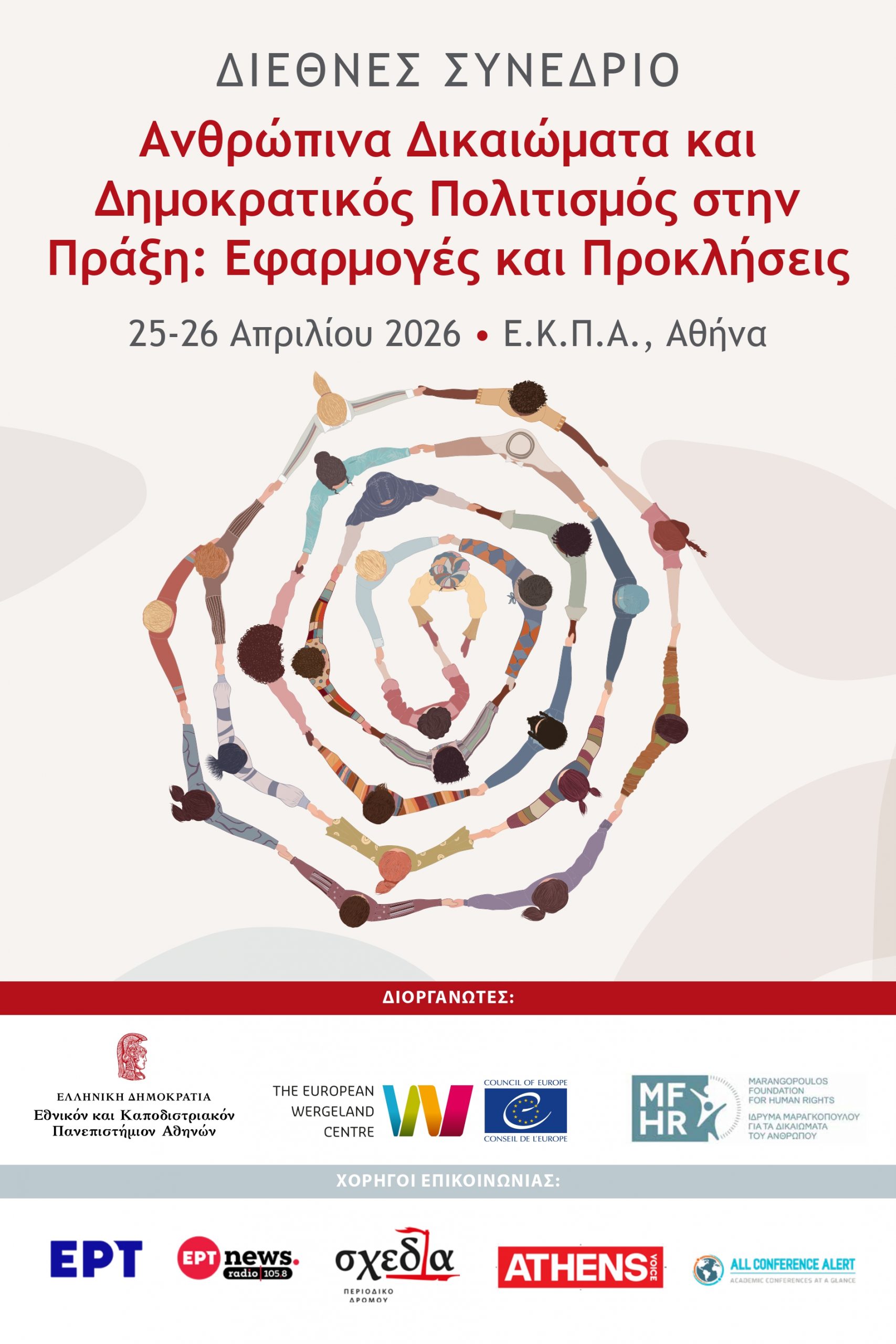 Το Κοινό Πρόγραμμα Μεταπτυχιακών Σπουδών «Ταυτότητα, Εκπαίδευση και Ικανότητες για Δημοκρατικό Πολιτισμό» του ΕΚΠΑ και του European Wergeland Centre, καθώς και το Ίδρυμα Μαραγκοπούλου για τα Ανθρώπινα Δικαιώματα, ανακοινώνουν την έναρξη των εγγραφών για το Διεθνές Συνέδριο «Ανθρώπινα Δικαιώματα και Δημοκρατικός Πολιτισμός στην Πράξη: Εφαρμογές και Προκλήσεις», το οποίο θα πραγματοποιηθεί στην Αθήνα, στις 25–26 Απριλίου 2026.
