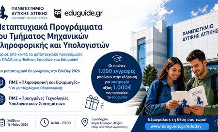 Στην έκθεση σπουδών EduDay 2026 που διοργανώνει το eduguide το Σάββατο 16 Μαΐου 2026 (16:00 - 20:00) στο Ξενοδοχείο Royal Olympic στην Aθήνα (100m - Μετρό Ακρόπολης) θα έχεις την ευκαιρία να γνωρίσεις από κοντά επιλεγμένα μεταπτυχιακά του Πανεπιστημίου Πειραιώς που καλύπτουν δυναμικούς και σύγχρονους τομείς: